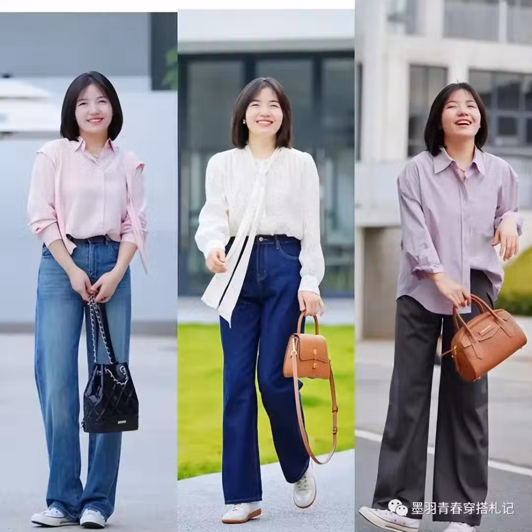 淺粉色襯衫搭配收腰牛仔修身褲和小白鞋,既減齡又能夠塑造出職業身份感,搭配襯衫時加入收腰的皮帶或腰封還能夠增強整體的氣場,呈現出井然有序的氛圍。
