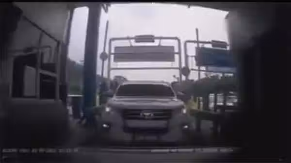 (吉隆坡12日訊)運動型休旅車華裔司機被指為了省過路費,緊貼前方轎車快速「過關」後,復踩油門超車到轎車前方時,卻突然緊急煞車,結果引發車禍!