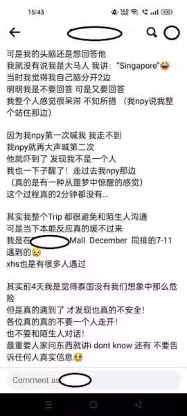 林小姐將自己在泰國險被迷魂黨詐騙的經過,在社交媒體上發帖控訴,望民眾多加小心。