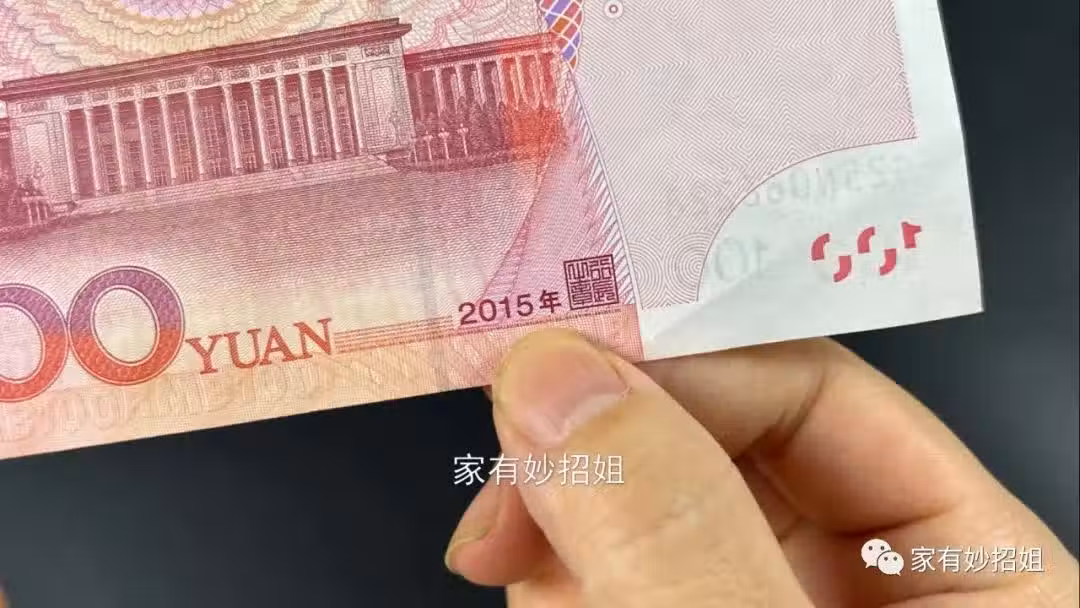 照片拍好後,我們再把它放大來看就可以發現,原來這一排小字寫的就是人民幣,這個就是真鈔了。要是我們收到的100紙幣,拍照後擴大來看,並不能看清楚這三個字的,這樣的錢幣就可能是假的,我們不要收了。