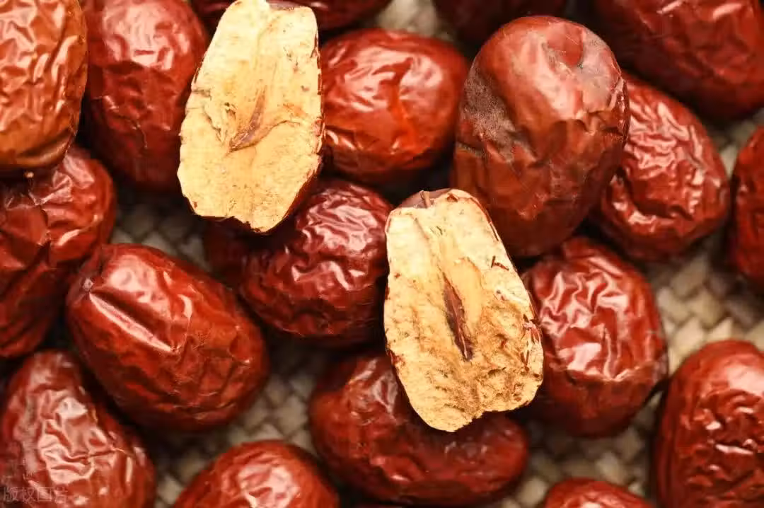 而正常的紅棗在經過晾曬風乾後,水分會由內而外流失掉,由於糖分的積累,棗肉變成了深黃色。