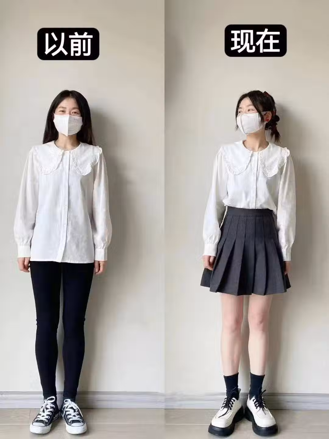 首先這件白色娃娃領襯衫是偏文藝復古、減齡那一類風格的,小黑褲太過正經沉悶不符合,換成有少女感一點的灰色百褶裙更合適。