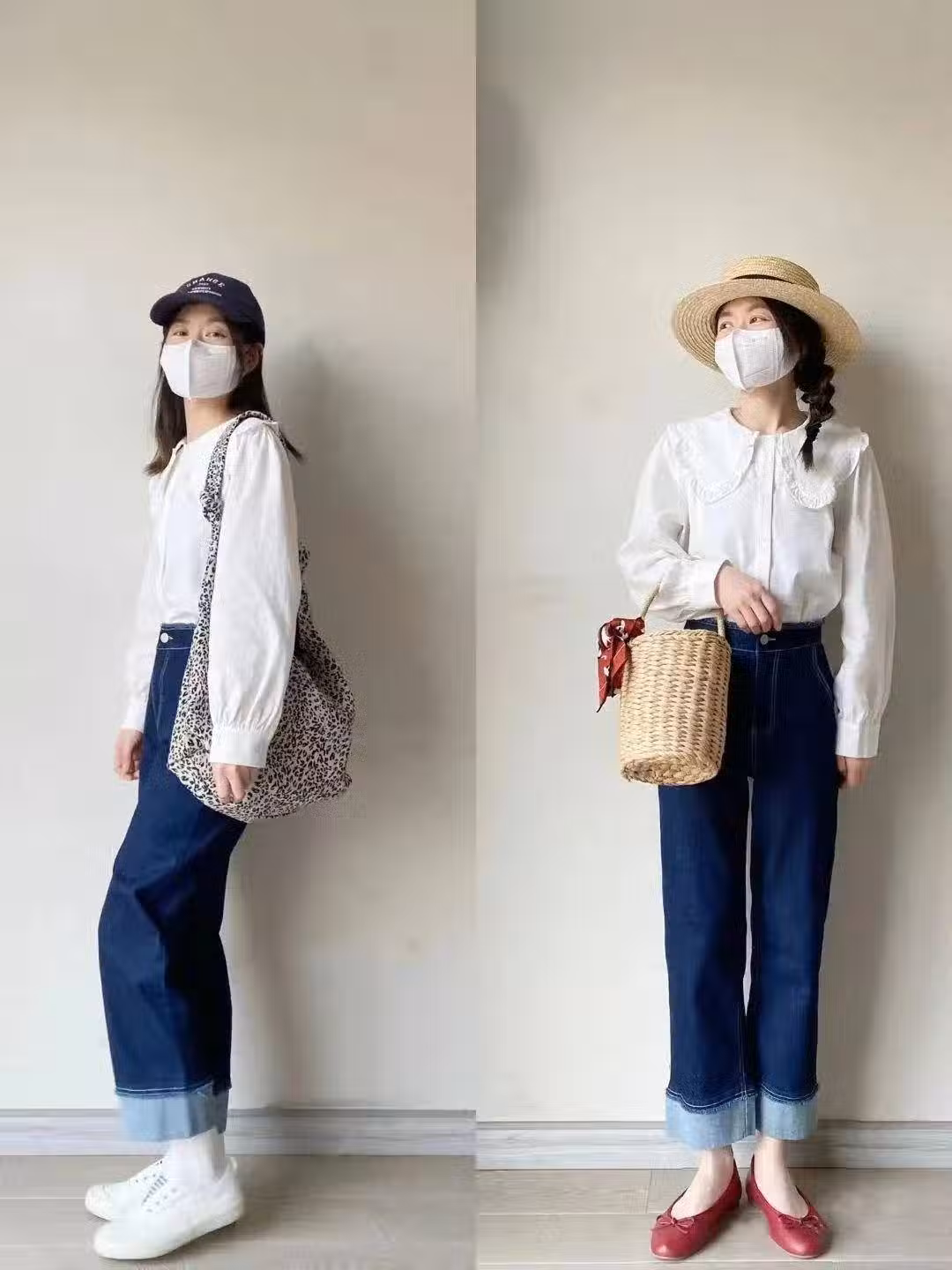 想要法式風,下裝換成經典元素的牛仔褲,白色娃娃領襯衫+深藍小翻邊直筒褲很顯清新優雅,記得衣服下擺扎進褲腰顯出腰線很重要,換上紅色芭蕾鞋,增添點法式浪漫元素。
