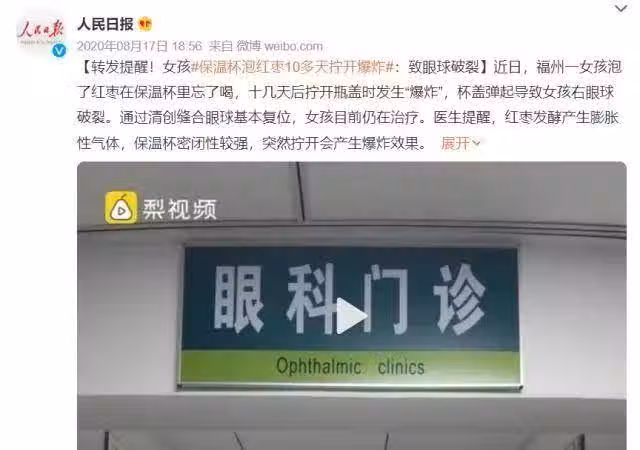 保溫杯作為日常生活中不可或缺的便利品,可以幫助我們隨時享受熱飲。然而, 近期有關保溫杯疑似「奪命杯」的報道引起了廣泛關注。報道提到一名女生使用保溫杯將紅棗泡了數十天後打開,杯蓋突然炸開並導致她的眼球被炸傷,可能面臨永久失明的風險。可見正確使用保溫杯也是一件值得我們區關注的事。