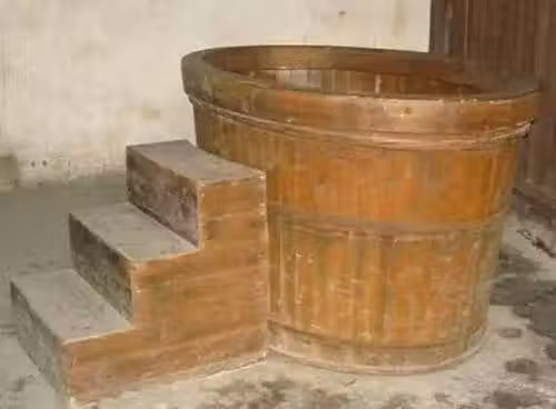 這種澡盆一般都很深,可以容納下整個人,然後把燒好的洗澡水倒入其中,