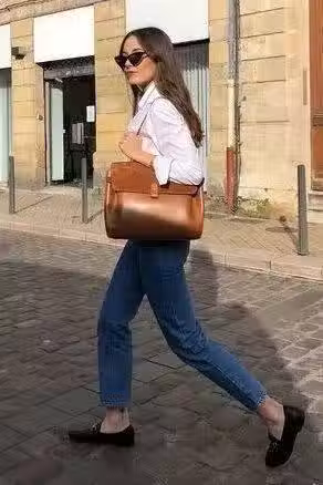 尖頭樂福鞋代表著成熟和銳利的氣場,有一定年紀的女人更能把它穿出味道,而對於喜愛簡約風的中年女性來說,春夏時期,樂福鞋最好的搭檔就是白襯衫了。