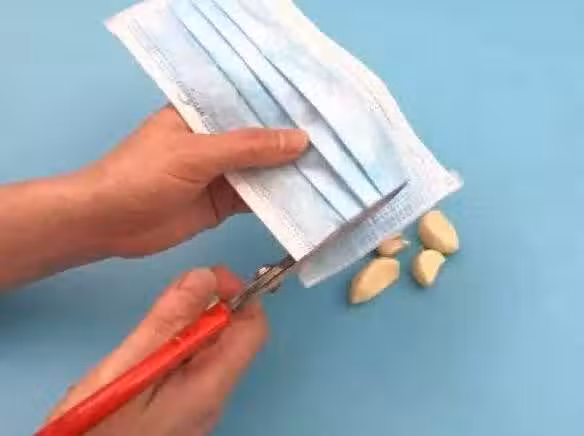 貯備好一個口罩,剪開口罩的一端,將少許茶葉和少許大蒜放到剪開的口罩里,再用剪下來的另一頭口罩將它系緊。