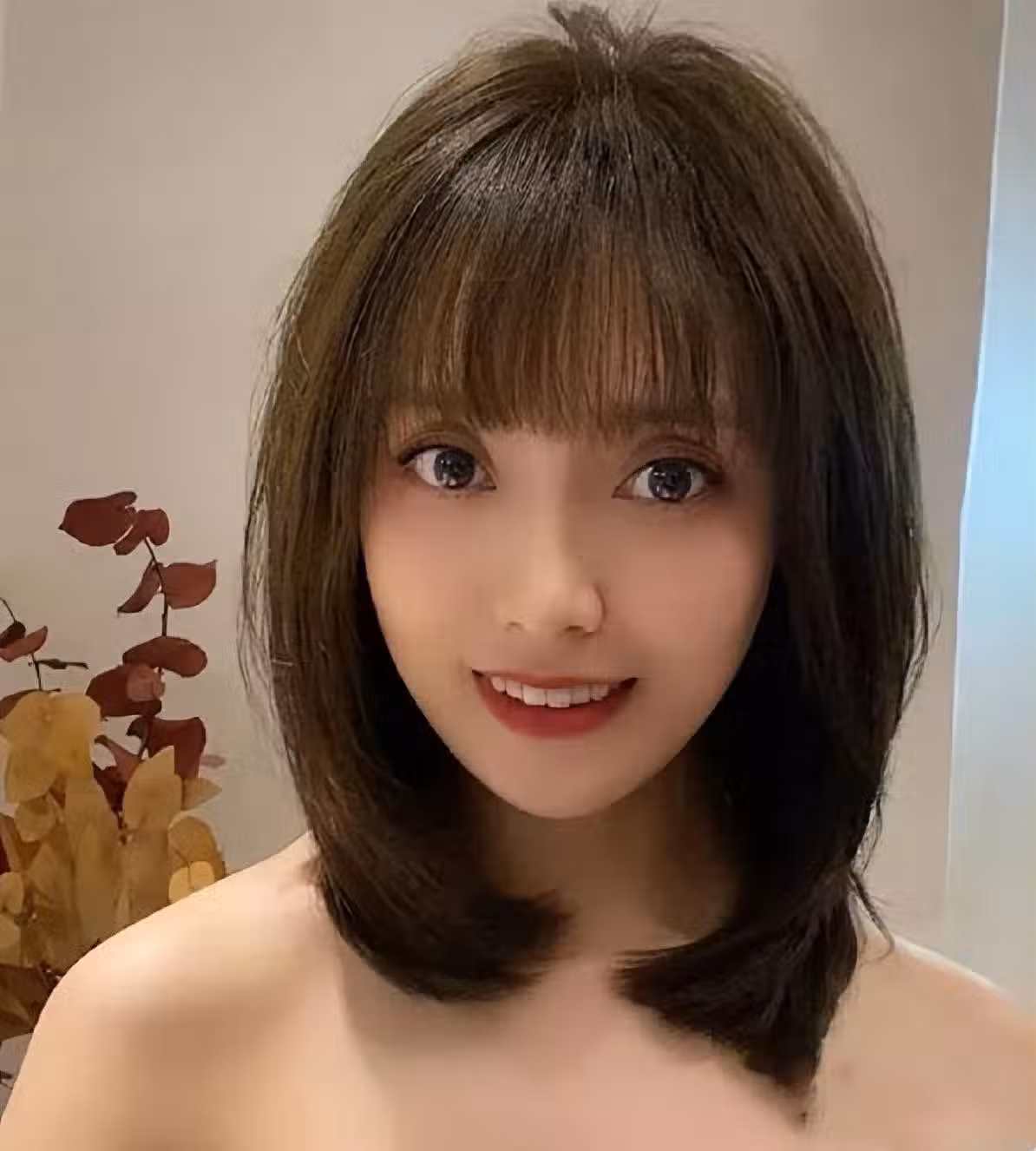 齊劉海自然而然的遮蓋額頭,給人感覺特別呆萌可愛,由於劉海運用超薄修理方式,特別零散的蓋住額頭感覺很輕,不會有一絲壓迫感,兩側的頭髮自然下垂並且髮尾做修薄處理,稍等內扣的設計可以修飾臉頰,讓鎖骨發更具時尚風情。