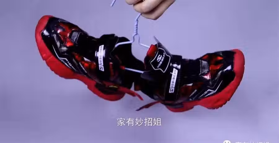 我們的鞋子就可以套在衣架上面了,一邊一隻鞋,一雙鞋都可以晾在一個衣架上,而且這樣鞋子是立著的,晾曬時就更容易曬乾了。