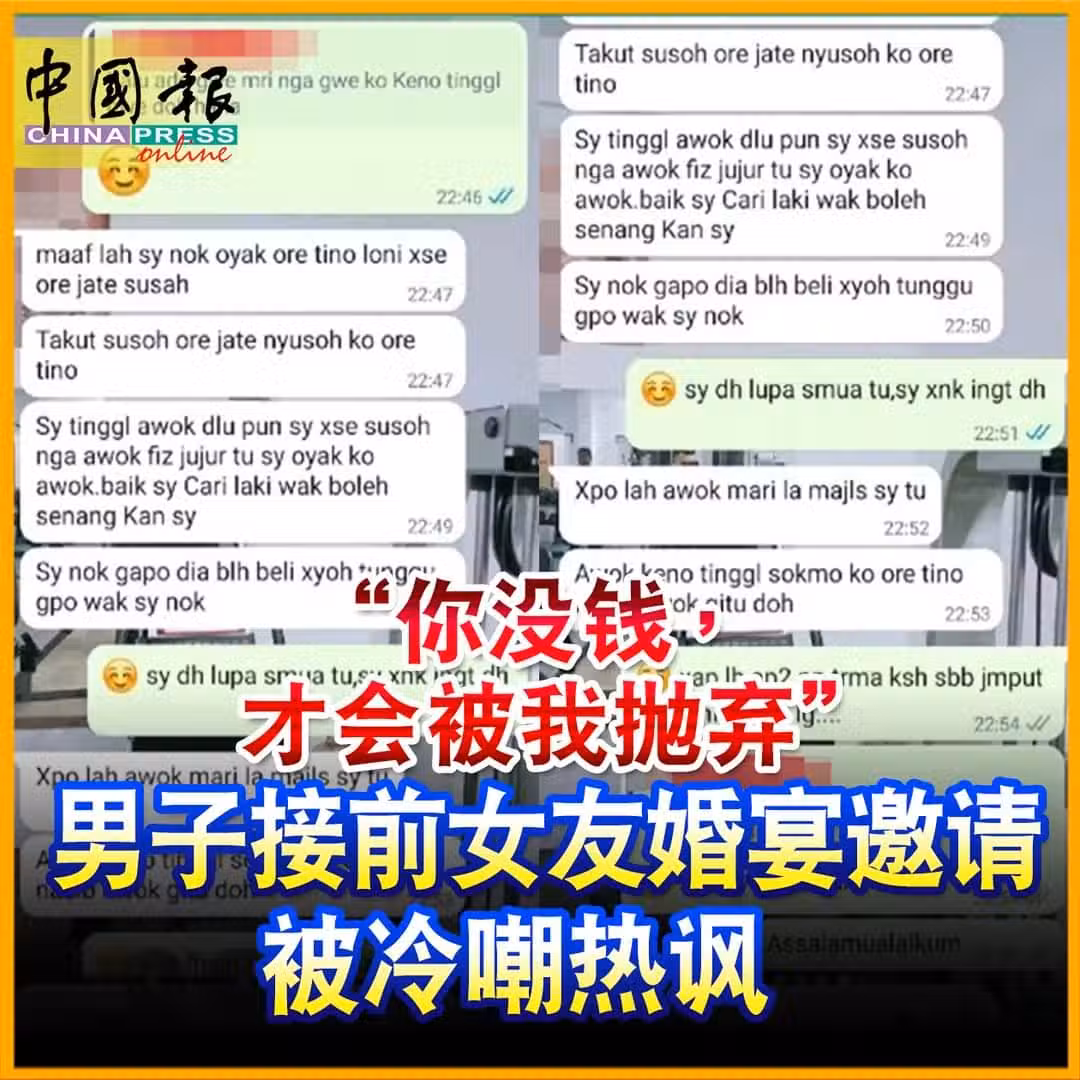 有網友留言指,「幸好你已經被她拋棄了,否則娶了她,苦的一定是你」、「這是請人出席婚禮該有的態度嗎?有必要這樣冷嘲熱諷嗎?」以及「她因為你窮而拋棄你,代表她從沒愛過你,不要灰心,你會找到真正愛你的女子「等留言。