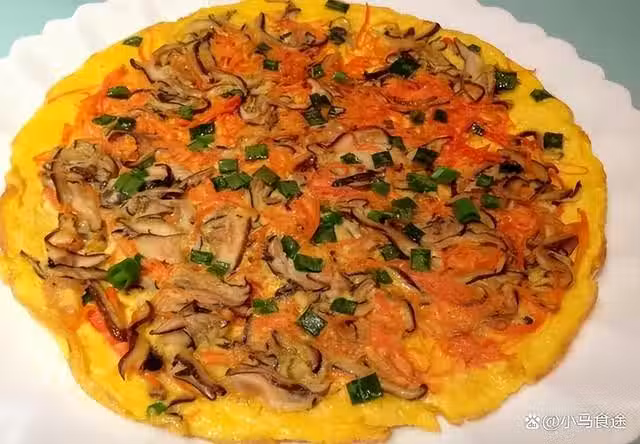 2.起鍋燒油,將鍋滑透,滑鍋的目的是防止煎蛋的時候粘鍋。將熱油倒出,鍋留少許底油,下入香菇胡蘿蔔,調入鹽、生抽、味精、雞精炒香,沿著鍋邊淋入蛋液,煎成蛋餅,出鍋即可。