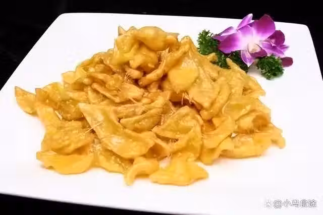 3.案板上鋪上一張雞蛋餅,刷上澱粉水,對摺,改刀切成菱形片,下入六七成熱的油鍋中,炸至蛋皮鼓起,炸至酥脆,二次復炸更酥脆,炸好即是酥黃菜,撈出控油備用。
