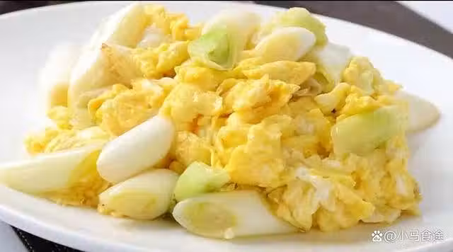 3.再起鍋燒油,下入大蔥段稍微爆一下,出香迅速下入炒好的雞蛋,調入鹽、少許胡椒粉,淋入少許香油,翻炒均勻即可出鍋裝盤。