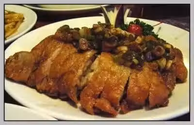 2. 起一油鍋,燒熱直至油溫到140°C,放入雞腿炸至金黃色,撈起切塊擺盤備用。