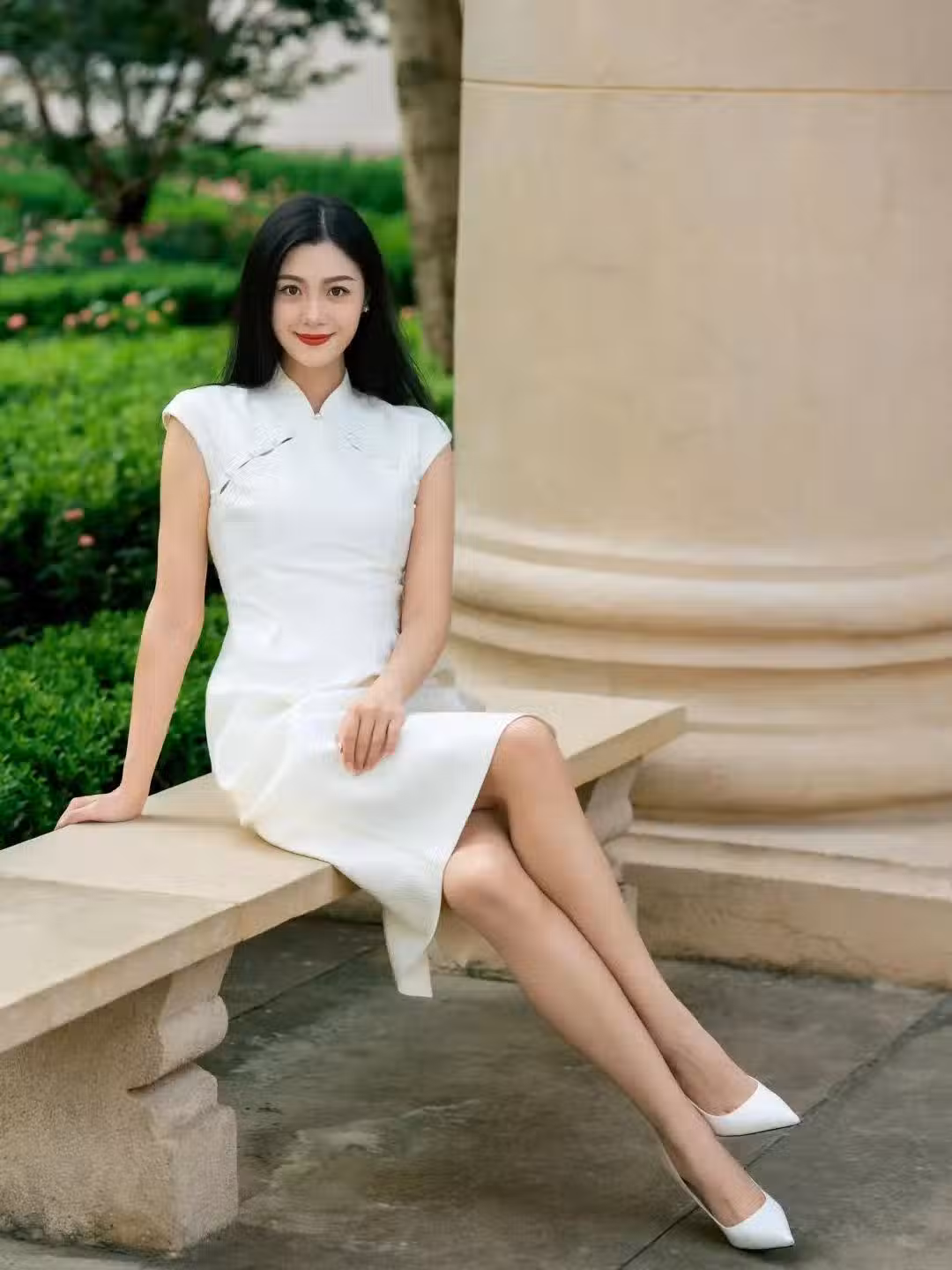 參考下圖的模特,雙腿交叉,腿部向鏡頭的一側延伸過去,向鏡頭展露自己好看的腿部線條,顯腿長不說,拍照也很優雅有氣質。