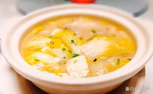 1.準備一個乾淨的砂鍋,起鍋燒熱加入一小勺豬油,放入黃心白菜,再放入嫩豆腐塊,添入適量高湯,大火燒開,小火慢煨,豆腐煨至滑嫩,調入鹽、味精、少許胡椒粉,攪勻,撒上蔥花美味即成。