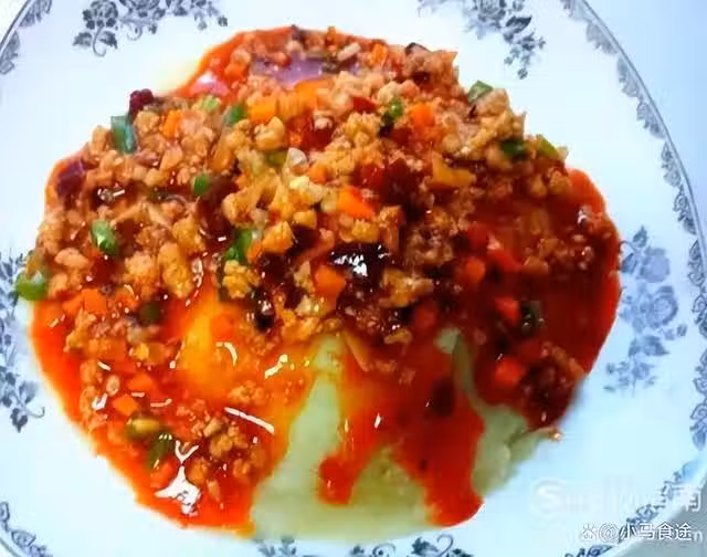 香辣肉沫土豆泥,土豆泥配上香辣味的酥肉末,拌飯正合適。
