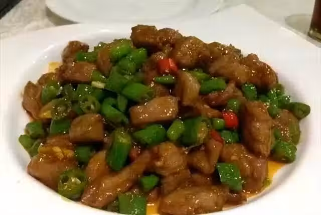 用牛肉做下飯菜的也有很多,這款尖椒牛肉粒之所以下飯,加入了酸豆角提味,尖椒提辣提色,川菜中很常見的調配方法。