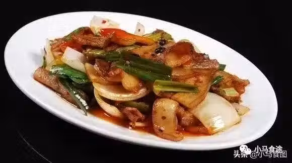 2.起鍋燒少許油,下入肉片爆香出油,起卷,下入豆豉多一些,甜麵醬少許,不加豆瓣醬也可以少加一點,主要體現豆豉的味道和香味,在調入少許白糖、醬油、下入洋蔥、青椒片炒香,下入蒜苗炒至入味斷生,即可盛出裝盤。