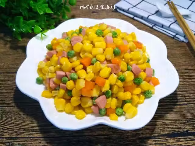 用料:玉米,胡蘿卜,青豆,火腿腸