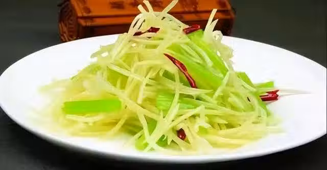 2.起鍋燒油,下入干辣椒、姜蒜絲炒香,下入土豆絲和芹菜段一起煸炒至剛斷生,調入鹽、味精、花椒油,翻炒均勻即可出鍋裝盤。