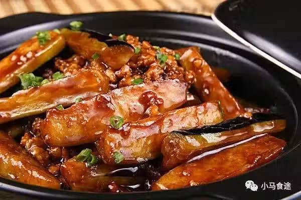 材料:嫩茄子、豬肉、胡蘿蔔、濕澱粉、色拉油、香菜、柱侯醬、味精、白糖、料酒、湯、蔥、薑絲。