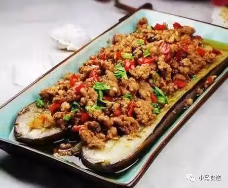 材料:長茄子、肉末、泡椒、蔥適量、姜適量、鹽、孜然粒、料酒、醬油、雞精、食用油適量