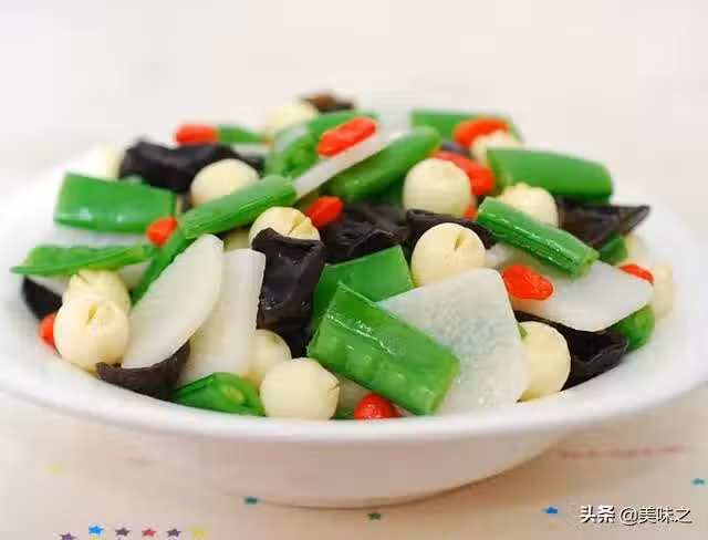 1、(A)木耳泡發洗凈撕成小朵。(B)將干蓮子浸泡2-3小時,去掉中間的蓮子心,洗凈備用。(C)山藥洗凈去皮切成小方片。(D)甜豆洗凈切成小段。(E)枸杞用水泡軟。