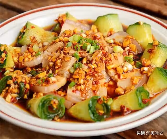 8、把黃瓜切成薄片,捲起來圍在盤邊,再把切好的白肉擺放在中間。