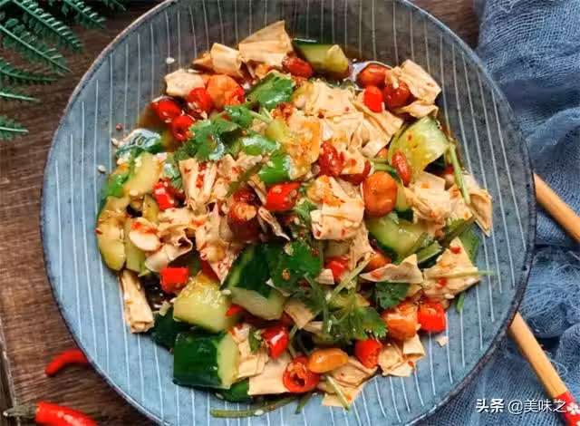 腐竹2-3根、黃瓜1根、熟花生米適量、香菜末少許、辣椒粉1勺、紅椒圈少許、熟芝麻1勺、蒜泥1勺、生抽2-3勺、醋3勺、鹽少許、花椒油幾滴、糖適量。