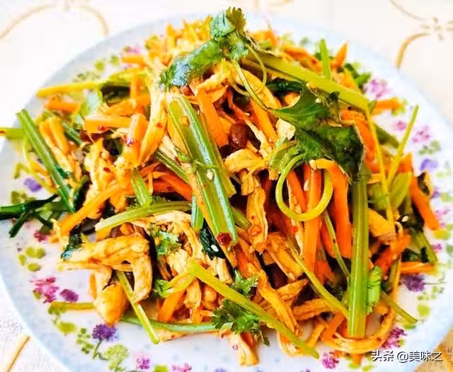 雞胸肉一塊、胡蘿蔔一根、芹菜一把、香菜一把、姜適量、蒜適量、蔥適量、八角適量、味極鮮醬油適量、陳醋適量、白芝麻適量、蚝油適量、白糖少許、老乾媽適量。