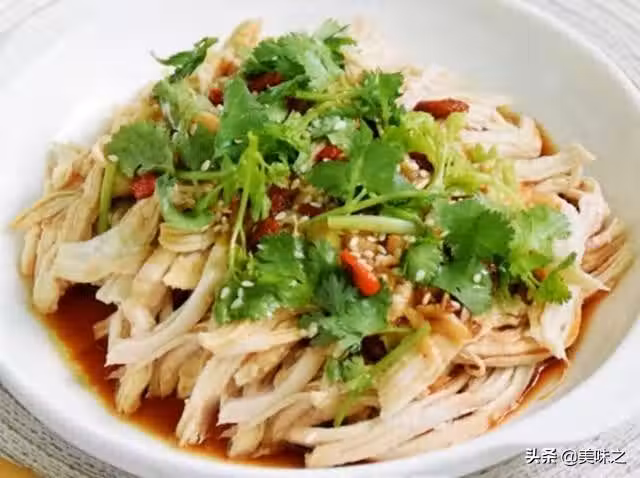 7、將料汁淋在雞絲上,灑上白芝麻加點香菜,吃的時候拌勻就行。