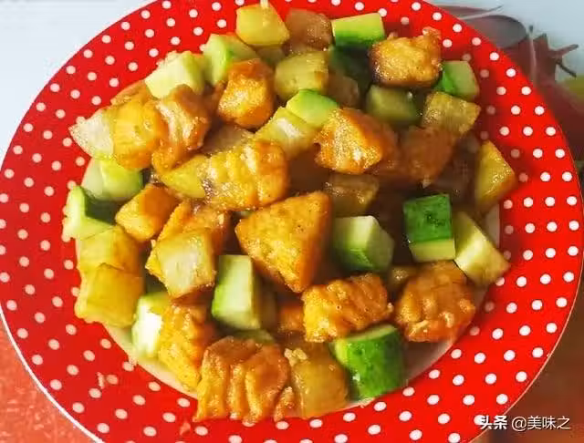 10、將三文魚丁、土豆丁、黃瓜丁同時入鍋快速翻炒。