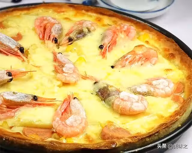 7、表面碼上北極蝦,再撒上一層奶酪。