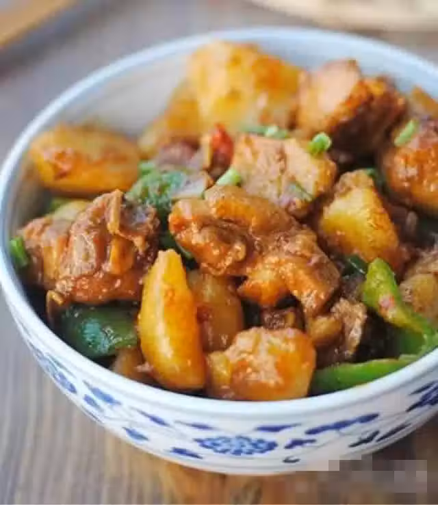 4、5分鐘後入土豆塊同煮,燉至土豆軟糯,加青椒、蔥調味,大火收稠湯汁即可。