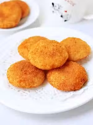 3、把土豆坯放在麵包糠裡,均勻地沾上麵包糠,靜止2-3分鐘
