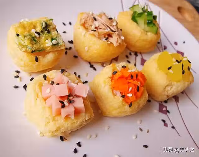 3、油豆腐一面開一個小口,等醋飯涼了之後,把它釀在油豆腐里。