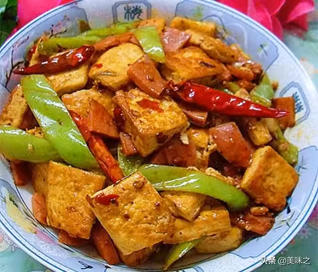 豆腐適量、香腸適量、青椒適量、蔥花適量、蒜瓣適量、干紅辣椒適量、郫縣豆瓣醬適量、水澱粉適量、花椒粉適量、生薑粉適量、生抽適量、蚝油適量、白糖適量、雞精適量、鹽適量。
