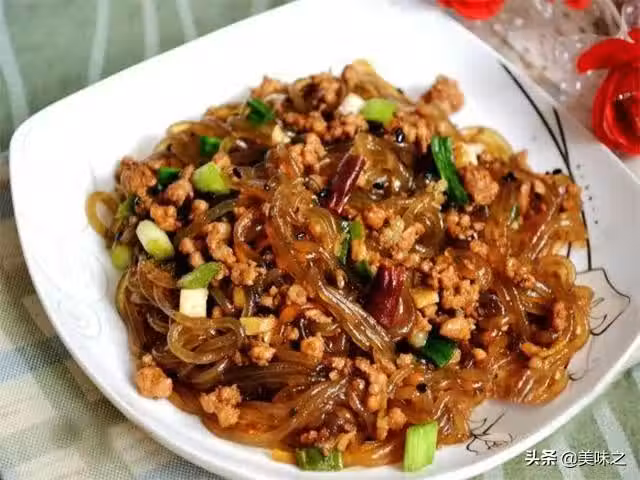 豬肉末100g、粉絲150g、油適量、鹽適量、料酒適量、糖適量、鮮抽適量、蔥適量、姜適量、蒜適量、辣椒適量、黑芝麻適量、雞精適量、老抽適量、辣椒油適量。