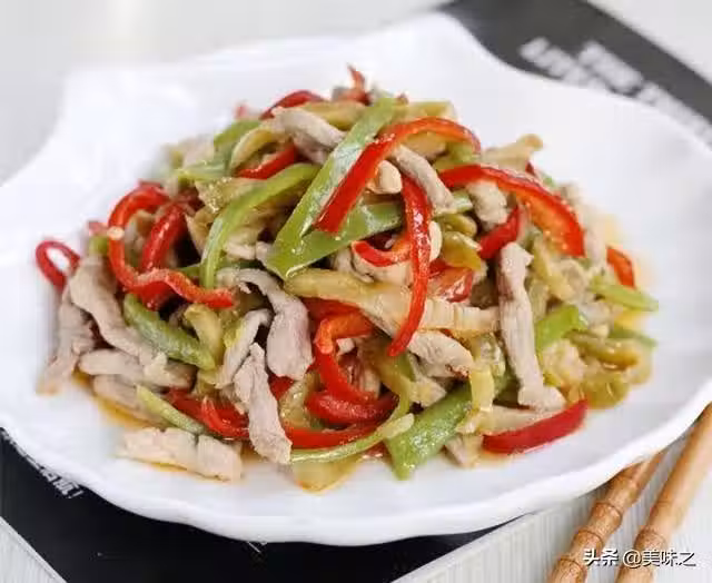 7、加肉絲翻炒,加雞精,翻炒均勻即可。