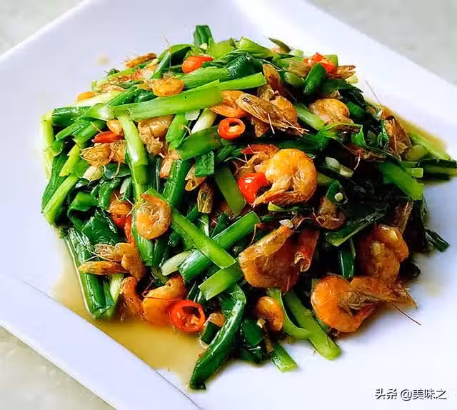 1、河蝦洗凈控干水份,一定要控干。韭菜洗凈切小段,辣椒切小圈,姜、蒜切碎。