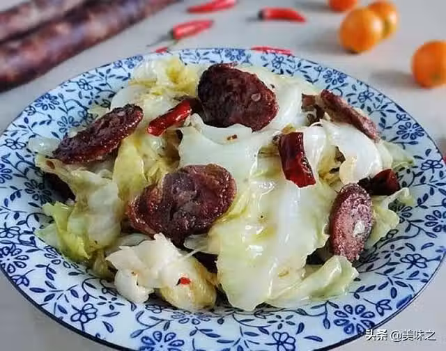 臘腸100克、包包菜200克、鹽適量、蒜適量、辣椒適量、味精適量。