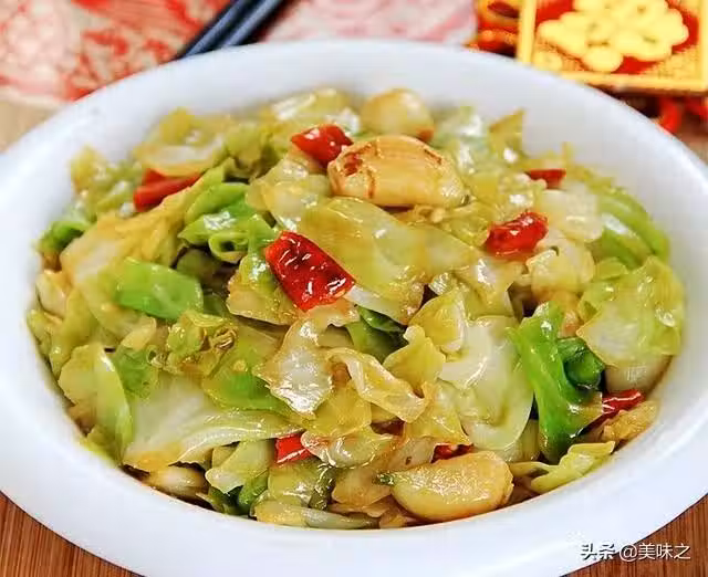 包菜一顆、蒜粒6粒、干辣椒6個、食用油適量、鹽適量、味極鮮醬油適量、醋適量、雞精適量。