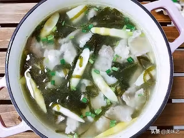 海帶300g、竹筍150g、豬肉150g、瑤柱30g、鹽適量、胡椒粉適量、澱粉適量、蔥花適量、油適量、雞精少許。