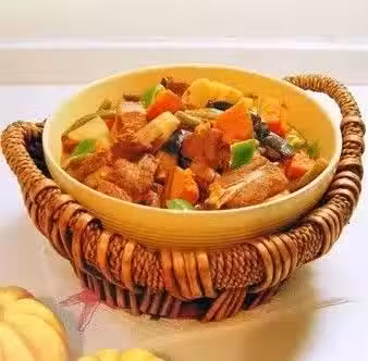 2.坐鍋點火到油,下八角、黃醬炒香,下入五花肉煸熟,再依次加入洋蔥、茄子、扁豆,燉熟後將菜撈出,用湯汁炒勻南瓜泥與土豆泥,出鍋前加入味精炒勻澆在菜中即可。