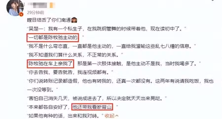 而當有人出來爆料吳楚一時,吳楚一本期望陳牧馳出面為他解釋一兩句,可惜對方根本不搭理他,以致於吳楚一說出更多的猛料。