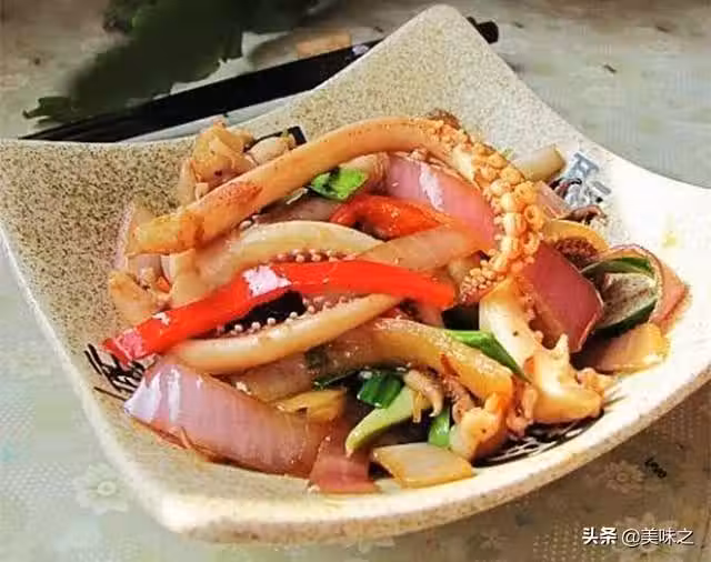 魷魚須400g、洋蔥1個、紅椒20g、蒜苗20g、油適量、鹽適量、蔥姜適量、蒜瓣2個、老乾媽香辣醬15g、生抽20ml、糖3g、料酒10ml、白酒2ml、胡椒粉適量、香油適量。