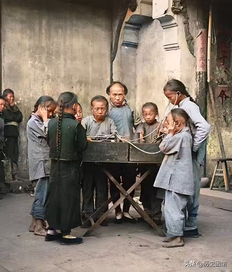 在街邊一個拐角處,一群孩子圍在一起。他們面前的桌子上,擺放著兩個木質的盒子。這其實是兩台留聲機。孩子們耳朵上戴著聽筒,仔細聆聽留聲機里傳出來的美妙音樂。