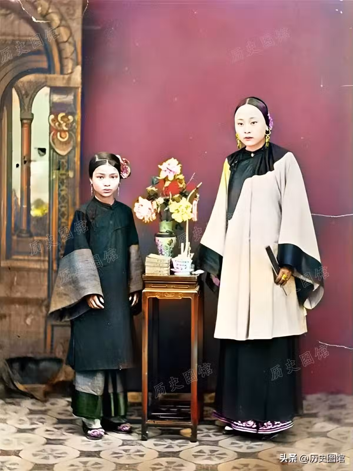 清朝時期,一名富家女子,站在方几前。旁邊站立的這名女孩,是通房丫頭。她的臥室是與主人的臥室是相通的,便於夜間伺候主人。