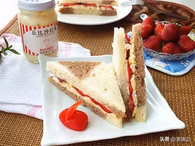 吐司片4片、雞蛋2個、草莓適量、沙拉醬適量、鹽少許、黑胡椒粉少許。